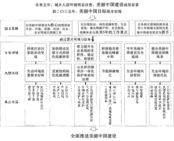 美丽中国建设是一项复杂的系统工程,需要从战略层面科学谋划部署。全面推进美丽中国建设要坚持目标导向和问题导向,以2035年美丽中国建设基本实现为总体目标,以解决当前美丽中国建设进程中存在的生态环境尚未实现根本好转、绿色低碳转型任务依然很重、生态保护修复任务长期且艰巨、碳达峰碳中和时间紧任务重、生态环境安全事件突发多发频发、美丽中国建设保障体系不够系统完善等突出问题为突破口,在新时代生态文明建设和生态环境保护工作取得举世瞩目成就的基础上,结合未来五年城乡人居环境明显改善、美丽中国建设成效显著的近期目标,以全面推进美丽中国建设为核心,统筹谋划生态环境、资源能源、经济发展、宜居宜业、安全健康等相关领域工作,以深入推进污染防治攻坚、全面绿色低碳转型、强化生态系统保护、稳步推进碳达峰碳中和、切实筑牢安全底线、系统构建保障体系等作为未来五年战略谋划的重点,以各相关领域的既有工作全面转向美丽中国建设要求为抓手,确定全面推进美丽中国建设的重点方向与任务,即持续深入打好污染防治攻坚战,加快推动发展方式的绿色低碳转型,着力提升生态系统的多样性、稳定性、持续性,积极稳妥推进碳达峰碳中和,守牢美丽中国建设安全底线,健全美丽中国建设保障体系。[11][12]随着我国生态文明与美丽中国建设不断取得新成就、面临新形势,重大方向与任务会有所变化调整。其中,污染防治、绿色低碳转型、生态保护、碳达峰碳中和等方向任务是今后五年美丽中国建设的“面子”,安全底线、保障体系等方向任务是美丽中国建设的“里子”。只有“面子”“里子”兼具,才能实现更好更快地全面推进美丽中国建设(见图1)。