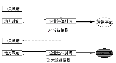 对于地方政府来说,大数据增强了地方政府环境治理能力。传统的环境执法取证方式受空间和时间的局限,而大数据通过突破时空局限降低执法成本,提高了地方政府环境治理能力。如,污染物在线监测大数据对企业排污状况进行实时记录,执法人员通过分析大数据筛选出超标排放企业,从而有针对性地开展现场精准执法,提高了对企业违法排污行为的识别概率,增强了执法能力。因而在大数据时代,地方政府的环境监管责任并不会减轻,随着履职能力的提高还会加强。