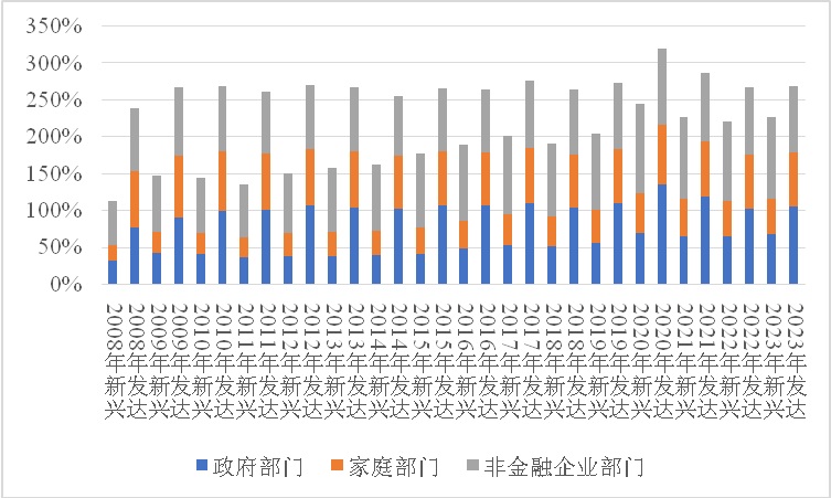 从国际视角看,新兴经济体和发达经济体负债率水平都有不同程度提升(见图1)。总体看,新兴经济体实体部门负债率从2008年的112%上升至2023年的227.2%,年均增加7.7个百分点,同期发达经济体实体部门负债率从238.8%上升至269.2%,年均增加2个百分点。发达经济体实体部门负债率一直高于新兴经济体实体部门负债率,但二者的差距越来越小,2008年前者较后者高126.8个百分点,到2023年前者只比后者高42个百分点,这说明在原有负债水平较低的情况下,为了促进经济增长,新兴经济体实体部门举借债务的规模较大、速度较快,而发达经济体实体部门本身负债率水平就比较高,考虑到债务可持续性,可以举借债务的空间也相对较小。分部门看,新兴经济体政府部门负债率从2008年的30.9%上升至2023年的67.4%,年均增加2.4个百分点,同期发达经济体政府部门负债率从76.5%上升至104.9%,年均增加1.9个百分点。新兴经济体家庭部门负债率从22%上升至48.4%,年均增加1.8个百分点,同期发达经济体家庭部门负债率从76.3%下降至73.4%,呈现降低负债水平的趋势。新兴经济体非金融企业部门负债率从59.1%上升至111.4%,年均增加3.5个百分点,同期发达经济体非金融企业部门负债率从86%上升至90.9%,年均增加0.3个百分点。对比看,新兴经济体的政府部门、家庭部门、非金融企业部门都在提升负债水平,分别提高36.5、26.4、52.3个百分点,而发达经济体政府部门负债率提高28.4个百分点,非金融企业部门负债率提高4.9个百分点,家庭部门负债率却下降2.9个百分点,特别是新兴经济体的非金融企业部门负债率从2013年开始已经高于发达经济体的非金融企业部门负债率。