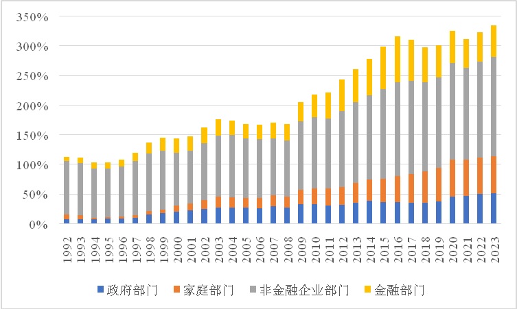从国内视角看,中国负债率水平呈较快上升趋势(见图2)。总体看,中国负债率水平从1992年的113.6%上升至2023年的334.5%,尽管中间有个别年份负债率水平有所下降,但整体上仍保持正向增长,年均增加10.5个百分点。分部门看,政府部门负债率从1992年的8.3%上升至2023年的51.5%,年均增加2.1个百分点;家庭部门负债率从7.5%上升至63.3%,年均增加2.7个百分点;非金融企业部门负债率从90%上升至167%,年均增加3.7个百分点;金融部门负债率从7.8%上升至52.7%,年均增加2.1个百分点。非金融企业部门负债率上升幅度较大,家庭部门次之,金融部门和政府部门紧随其后。对比看,中国非金融企业部门负债率相对较高,早在2003年就突破100%,2023年更是高达167%,基本高于同期新兴经济体非金融企业部门负债率,更高于同期发达经济体非金融企业部门负债率。
