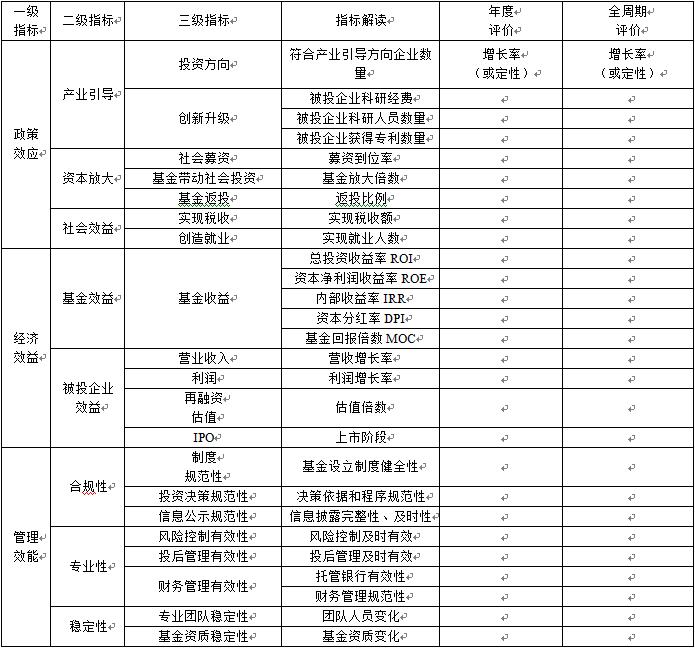 从2级指标对应的可量化的内容看,产业引导效应要素包括:基金投向、被投项目的创新能力与转型升级;资本放大效应要素包括:基金放大倍数、募资到位率、基金返投比例;社会效益,即基金投资企业实现的税收和创造的就业。这些相应的内容构成了绩效考核的3级指标。