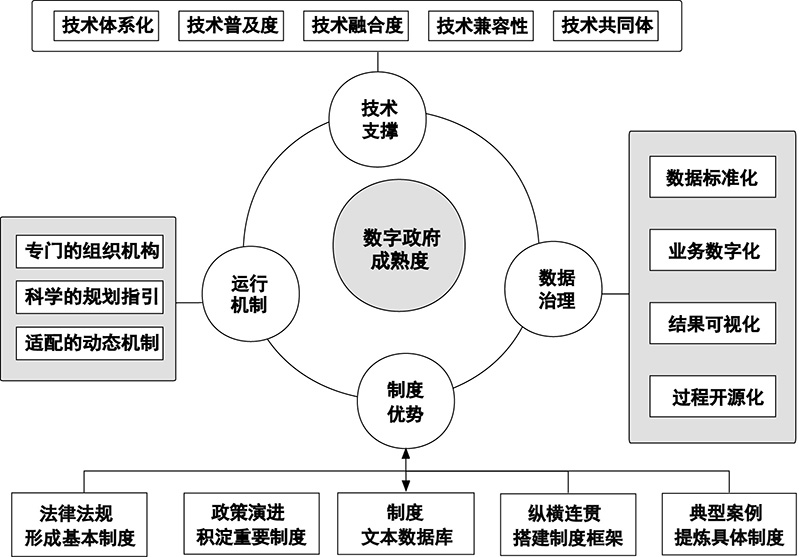 我国的数字政府是由政府、企业、社会等多元主体共同参与的复杂系统,必须发挥党的领导、集中力量办大事等制度优势,建立更加适应数字时代的制度体系。技术嵌入治理推动政府职能转变,关键仍在于政府这一治理主体,技术与治理融合也更加需要制度约束。[8]数字政府成熟度越高,说明政府、社会等各类主体数字化水平整体提升越好,其中各类制度发挥“桥梁”“纽带”作用。一类是约束政府权力运行的法律法规。任何制度都是由整套规则、法律法规构成的相对独立体系,各项法律法规之间往往相互交叉、彼此支撑。另一类是与技术创新应用相配套的政策体系。技术嵌入政府治理更加偏重于通用性政策,包括与技术管理、接口标准、网络监控以及与数据治理等有关的政策等。还有一类是数字政府建设中提炼出的具体制度。从典型案例中总结针对性强的非正式制度不乏先例,《指导意见》提到的“最多跑一次”“一网通办”等创新举措,就是各地结合自身实际努力试验的成果。在此基础上,需要坚持系统观念搭建制度框架,着力形成不同类别制度的整体合力,界定各自的“权力”边界和适用范围,突出不同制度的关联性和层次性。