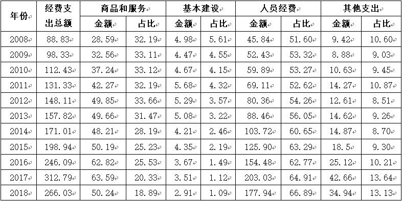 表2 2008-2018年经办机构各科目经费支出变动情况(亿元,%)