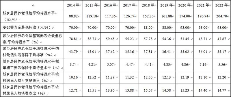表1 2014-2022年全国城乡居民养老保险待遇水平及其与相关指标的比较①