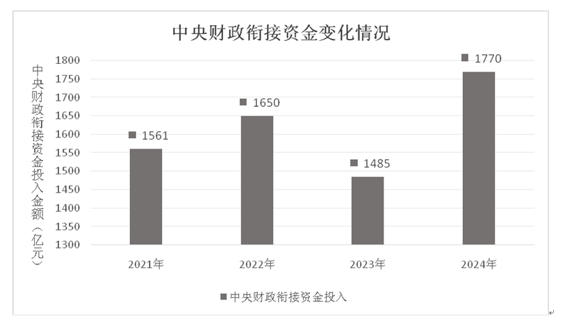 2021年2月,习近平总书记在脱贫攻坚总结表彰大会上指出,打响脱贫攻坚战8年来,中央、省、市县财政专项扶贫资金累计投入近1.6万亿元,其中中央财政累计投入6601亿元。“十三五”时期中央财政累计安排补助地方专项扶贫资金5305亿元,连续五年每年新增安排200亿元,这样的投入强度在历史上前所未有。脱贫攻坚任务完成后,中央又强调过渡期内要保持财政支持政策总体稳定。事实上,中央财政的投入不仅稳定,而且在高位上进一步大幅增加。2021年中央财政衔接推进乡村振兴补助资金安排1561亿元,比原中央财政专项扶贫资金增加100亿元①?。2022年安排补助资金1650亿元,同口径较2021年增加84.76亿元。[5]2022年底中央财政提前下达2023年衔接推进乡村振兴补助资金1485亿元,2024年补助资金规模增加到1770亿元,总量和增幅均创历史新高。[6]