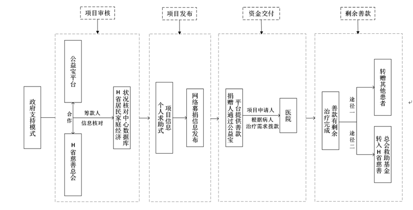 H省慈善总会启动了“慈善医疗众筹”项目,并与民政部指定的网络募捐信息发布平台之一公益宝合作,发布众筹项目信息。公益宝平台在H省政府的支持下,接入H省居民家庭经济状况核对中心数据库,在项目审核阶段利用信息技术自动核对筹款患者的经济状况,减少了申请人和受益人材料造假现象。个人网络众筹项目在公益宝平台上筹集到的资金,项目发起人或受益人不得提现,由项目申请人根据患者的治疗需要拨款给医院。患者治疗结束后的剩余资金可直接转赠给平台上的其他患者或存入H省慈善基金会的救助基金。[23]