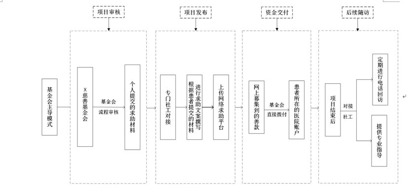 B市采用的模式主要体现在针对儿童大病的慈善捐赠中。X慈善基金会是一个旨在帮助白血病患者的公募基金会。对于个人求助,X慈善基金会安排专门的社工与患者联系。专门的社工根据患者提供的信息撰写求助材料,并上传至求助平台。筹集到的资金由X慈善会直接支付到患者所在的医院账户。资助完成后,社工还将定期电话回访,为患者提供专业建议。[24]