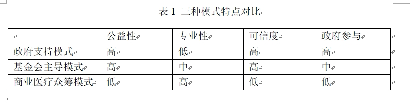 基于医疗众筹的第三次分配性质,医疗众筹模式应当具有一定公益性,即是具有非营利性且兼顾社会效益的项目。为了准确传递求助者信息与提供帮助,模式也应具有一定的专业性,以帮助患者文本撰写、确保资金合理使用等。此外,医疗众筹的募资能力来源于大众对它的信任度,哪一种模式更让人相信,是重要的评估维度。故本文从公益性、专业性、可信度和模式本身运作的政府参与程度四个方面展开模式比较。