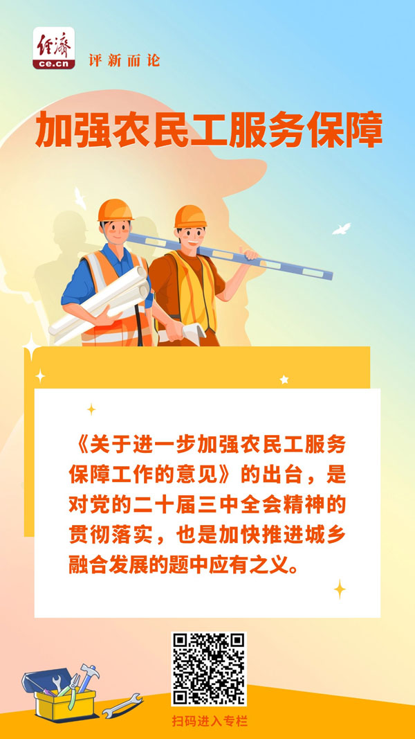数据显示,目前全国农民工约有3亿人,其中外出务工农民工1.9亿人。党的二十届三中全会《决定》提出,“完善高校毕业生、农民工、退役军人等重点群体就业支持体系”“健全灵活就业人员、农民工、新就业形态人员社保制度”。加强服务保障工作,让农民工更好安居乐业,关乎亿万家庭的幸福。《意见》的出台,是对党的二十届三中全会精神的贯彻落实,也是加快推进城乡融合发展的题中应有之义。