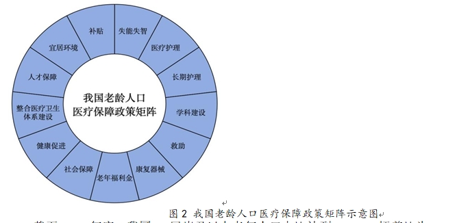 我国在“十四五”规划中,将推进健康中国建设、实施积极人口老龄化战略,特别是把健康和养老服务列为发展目标。涵盖社会保障、健康服务、社会参与、产业发展等,与OECD等国际社会提倡的以科技支撑积极老龄化指数(PAI)中的关键指标保持一致。依据《中华人民共和国老年人权益保障法(2018年修正)》,构建了“保险、福利、互济”相结合的支付体系,涉及补贴、救助、健康促进、整合医疗卫生服务体系建设、失能失智干预、护理服务、长期护理保险、医养结合、人才保障、老年人宜居环境改造、养老保障和医疗保障等多个方面,形成了我国的老龄人口医疗保障政策矩阵(见图2)。