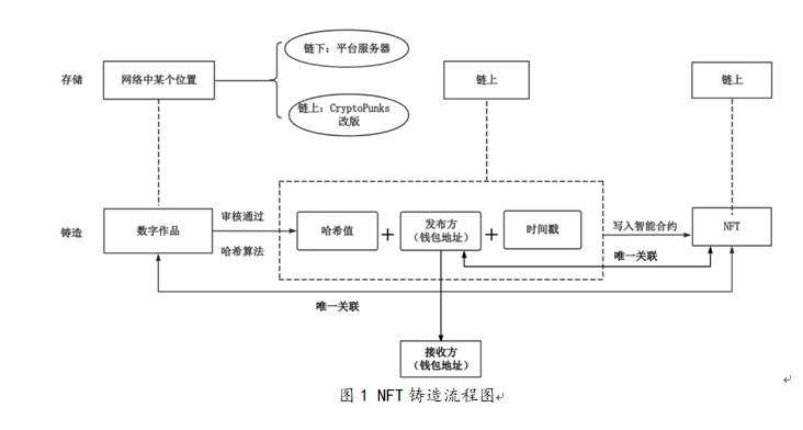 NFT的铸造发行过程,实际上包含了对该数字作品的复制、上链和信息网络传播三方面行为。以杭州互联网法院审理的我国第一期NFT争议案件为例 ,NFT数字作品的铸造过程如下:首先,发行人(已注册用户)将图片、动画、音频、视频等数字作品上传NFT发行平台,同时由发行人在系统内自行填写数字作品名称、创作人情况、作品介绍等基本信息。其次,由发行人选择发行条件,即“单个”发行还是“多个”发行,以及本次交易对应的底层智能合约。再次,由发行人向平台支付服务费,支付费用后提交平台审核。最后,平台审核通过后,通过哈希算法将用户上传的“数字作品文件”转换为特定长度的哈希值,然后将哈希值、发布方、时间戳等信息采用区块链技术在链上进行记录,生成NFT上架交易。需要强调的是,NFT铸造过程中原始数字图片往往存储在平台服务器内,上链铸造后的NFT本身并不存储原始数字作品文件但会记录文件对应的哈希值,整个铸造流程如图1所示。