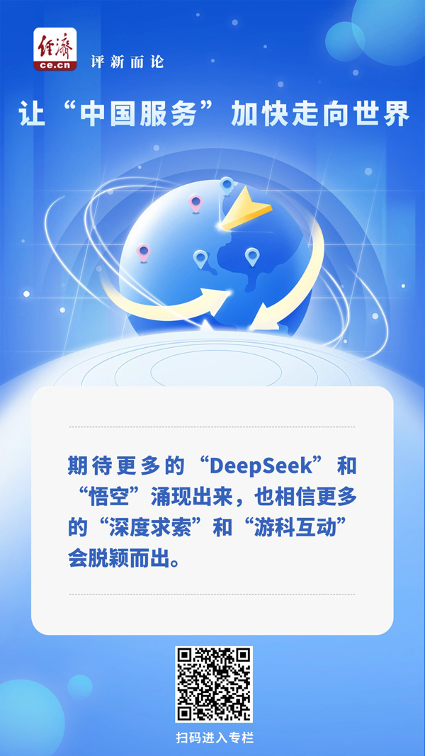 未来随着我国产业结构、消费结构的不断升级,服务贸易将形成快速发展的内在需求,使服务贸易迎来广阔的发展空间。特别是信息技术服务、文化和娱乐服务等重点领域,有望吸引更多市场关注。期待更多的“DeepSeek”和“悟空”涌现出来,也相信更多的“深度求索”和“游科互动”会脱颖而出。(中国经济网评论员 邓浩)