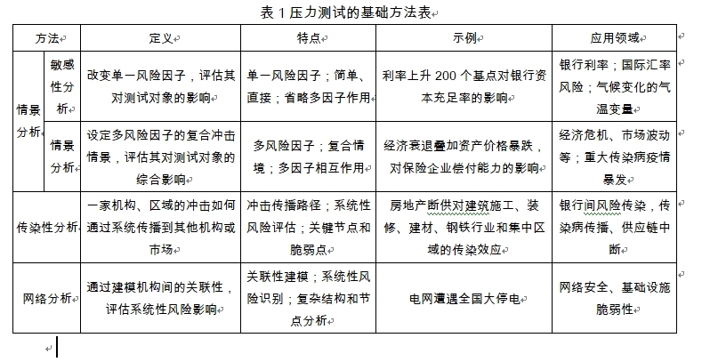 压力测试基础方法包括敏感性分析、情境分析、传染性分析、网络分析等。[6]敏感性分析、情景分析分别是设定单一风险因子或多种风险因素的冲击情景,分析计算影响的后果;传染效应是评估一家机构或市场冲击情景,如何相互作用、迅速传播;网络分析则是金融机构间的相互关联性建模,分析关联影响(见表1)。