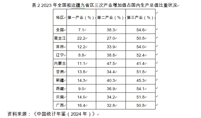 一是产业结构单一且整体层次偏低。从三次产业结构占比看,边疆九省区第一产业占比普遍高于全国平均水平,最高的省区达到22.2%,高于全国平均水平15个百分点;第二产业占比则普遍低于全国平均水平(如表2所示)。边疆地区产业主要是农产品、矿产资源开采和简单加工,多依赖于本地自然资源和低成本劳动力优势,其产品在市场价值链中处于较低端,与新质生产力要求的高端化、智能化相比差距较大。二是外贸商品结构亟待升级。边疆九省区外贸出口大多以纺织品、服饰、民族工艺品、金属矿、农副产品为主,主要集中于原材料的初级加工环节。尽管边疆地区的新能源汽车、锂电池、光伏产品等出口规模也日益扩大,但主要还是能源资源型、劳动密集型产品,缺乏深度开发且科技含量不高。根据公开数据测算,西南边疆和西北边疆省区劳动密集型产品出口占比都远高于全国平均水平,最高达到46.37%。三是贸易业态和渠道有待优化。一方面,不少沿边地区贸易以边境贸易为主,虽然有其必要性,但也限制了贸易规模和发展质量。例如,根据《新疆维吾尔自治区2024年国民经济和社会发展统计公报》的数据测算,新疆边境贸易额占其全部对外贸易的比重约为53%。过度依赖边境贸易会导致对外贸易渠道单一,降低了抵御外部风险的能力。另一方面,边疆地区跨境电商、数字贸易等外贸新业态的市场规模较小,对区域经济的拉动作用不强。