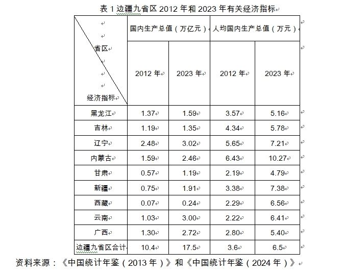 边疆地区发展新质生产力不仅内含了深厚的理论逻辑,而且具有强大的现实支撑。新时代以来,边疆地区经济社会发展取得突出成就,主要经济指标均大幅跃升(如表1所示)。根据权威数据测算,2012—2023年,我国黑龙江、吉林、辽宁、内蒙古、甘肃、新疆、西藏、云南、广西等边疆九省区的国内生产总值(GDP)总和从10.4万亿元增长到17.5万亿元,人均国内生产总值从3.6万元增长到约6.5万元。根据《中国统计年鉴2024》,2012—2023年,边疆省区的科技研发力度不断加大,规模以上工业企业研发经费投入从697亿元增长到1320亿元,翻了近一番。可以说,边疆地区既有必要、也有基础、还有能力发展新质生产力。总体而言,边疆地区发展新质生产力具有资源禀赋支撑坚实、撬动催化因素多样、制度保障有力三大优势条件。