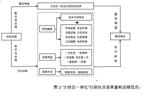 进入21世纪,从中央到地方均认识到行政执法改革的重要性,并推动各地开展实践探索。2014年,党的十八届四中全会审议通过的《中共中央关于全面推进依法治国若干重大问题的决定》提出,要推进综合执法,大幅减少市县两级政府执法队伍种类,完善市县两级政府行政执法管理,加强统一领导和协调。党的十九届四中全会强调,进一步整合行政执法队伍,继续探索实行跨领域跨部门综合执法。党的二十大报告强调,全面推进严格规范公正文明执法,加大关系群众切身利益的重点领域执法力度,完善行政执法程序。2022年初,中央决定在Z省开展“大综合一体化”行政执法改革试点。试点表明,Z省S市K区“大综合一体化”行政执法改革作为Z省“整体智治”实践创新的典型案例,较好解决了“交叉执法、多头执法、重复执法、空白执法”等问题,说明“整体智治”治理模式可以有效解决科层组织“条块分割”问题,促进传统科层治理“以政府部门履职为中心”的治理模式向敏捷治理情境下“以社会需求为导向”的“整体智治”治理模式转型。
