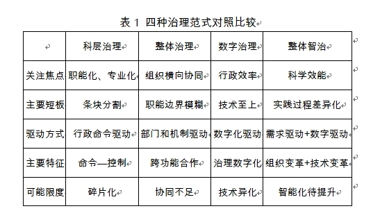 科层组织因适应工业化管理所需要的专业偏好和效率诉求,而成为大型组织普遍采用的基本组织模式。然而,其弊端也与生俱来,“条块分割”问题已成为推进治理现代化必须破解的难题,理论和实践呼唤治理范式创新。半个多世纪以来,旨在破解科层组织弊端的治理范式不断创新,然而,传统的解决思路均属于阶段性或暂时性解决方案。其中,整体性治理理论和数字化治理是针对性和普适性较强的范式创新,不过其限度也较为明显。那么,从Z省实践中诞生的“整体智治”模式能否代表一种新的理论范式?笔者认为,“整体智治”兼容了整体性治理和数字化治理等两种理论范式的优势,是有利于克服科层治理既有弊端的一种前瞻性治理范式,表征着破解科层治理难题的未来趋向。这里将与“整体智治”相关的四种治理范式进行对比,可发现其间存在的显著差异(见表1)。长期以来,针对科层组织“条块分割”问题,理论和实践均开展了有益探索,特别是强调横向协同的整体性治理范式,在“过度集权化”和“过度碎片化”两端之间反复摇摆。然而,综合整体性治理与数字化治理优势的“整体智治”,超越了科层组织专业主义、职能“分殊化”、科层化“命令—服从”等与敏捷治理时代不相适应的组织特征,以社会需求为导向,在合理界定政府职能部门权力边界、权力清单和权力结构的基础上,依托数字化智能化工具再造行政流程,赋予职能部门更多自由裁量权,从而重构“多跨协同”治理模式。