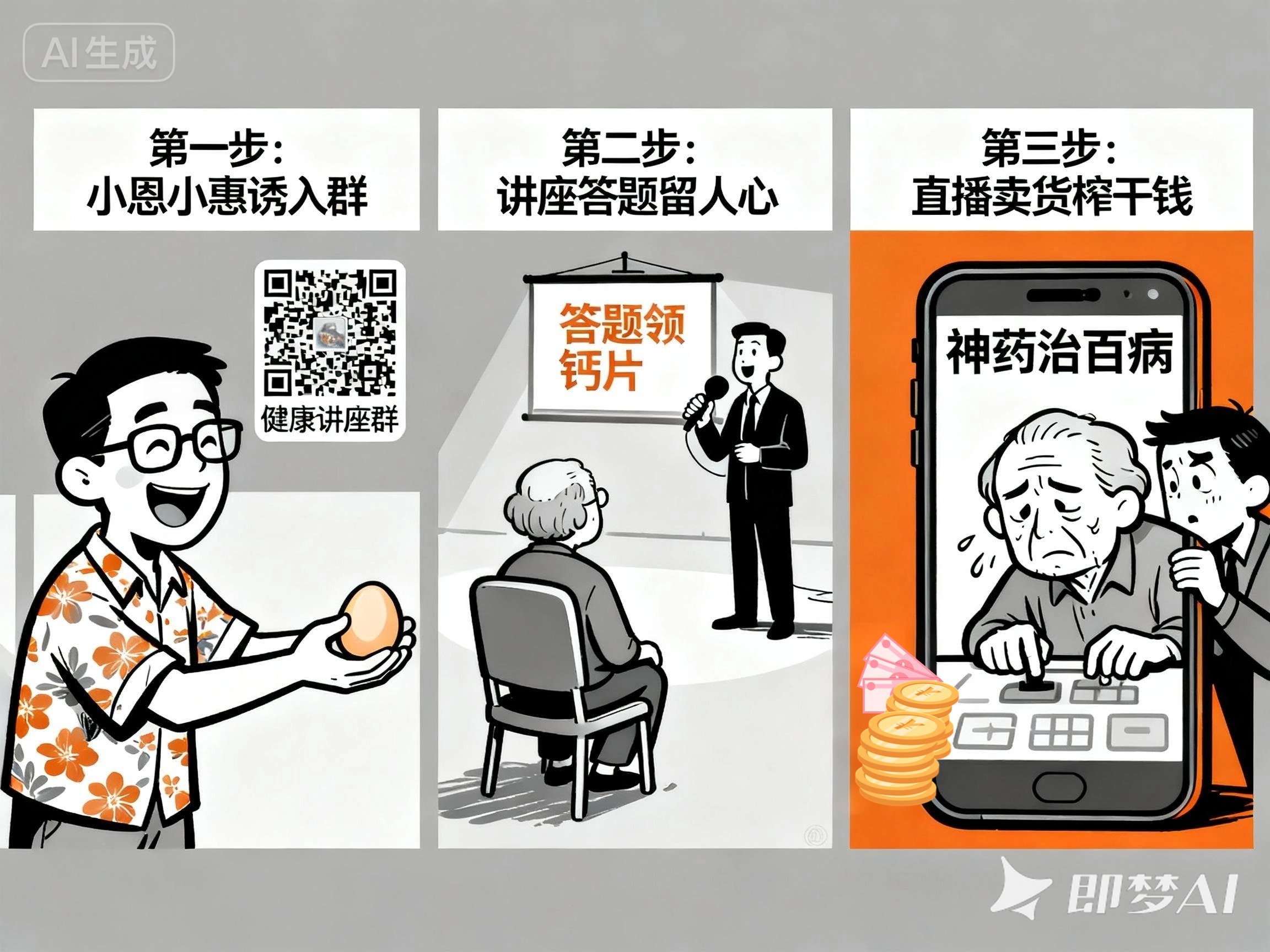 说到领鸡蛋,很多老年人的确抵挡不住“免费”的诱惑,但也觉得这不过是贪点小便宜,不会有什么“坑”的。殊不知,某些运营者就是先利用“小恩小惠”诱导他们进入群聊,再通过直播讲座、答题给“奖励”等方式留住这些老年人,最后利用私域直播“花式卖货”坑骗老年人。而且,不少私域直播还需要输入密码或通过邀请才能进入直播间,且直播内容大都无法回看,不留明显痕迹。这种封闭环境为不法人员对老年人进行“洗脑式”营销、销售假冒伪劣商品提供了便利,也给监管增加了难度。