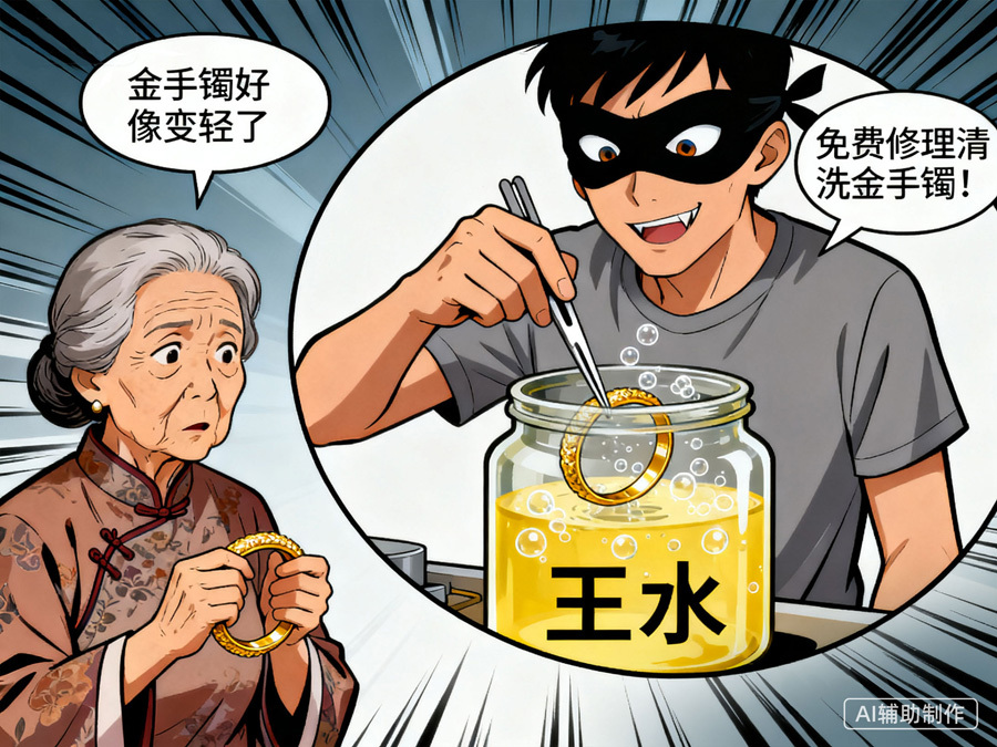 近日,浙江临海市某集市上,摊贩于某(化名)以“免费修理、清洗金手镯”为由头吸引顾客。王阿姨(化名)的金手镯被于某用“王水”清洗后,重量少了5.33克。目前,于某已被当地公安机关刑事拘留。
