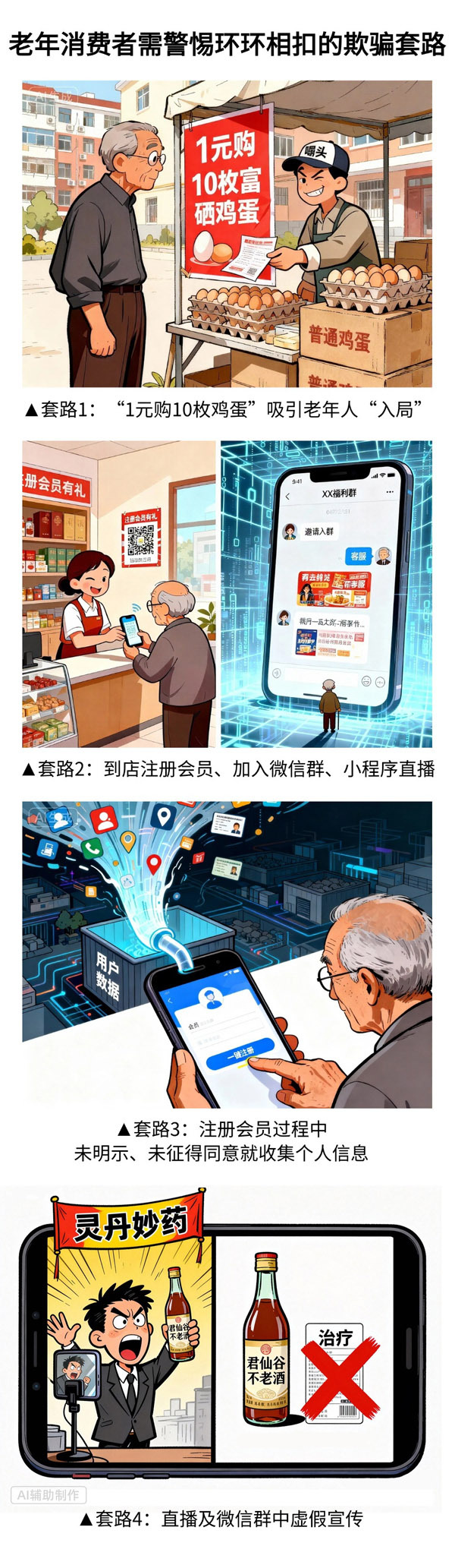 “1元购10枚鸡蛋”吸引老年人“入局”,“永葆青春、延长寿命”“淡斑美白”“提高免疫力”“抗辐射、抑制癌细胞”等功效宣传戳老年人健康需求——市场监管总局公布的七起老年人药品、保健品虚假宣传典型案例再次为老年消费者敲响警钟。不法商家用“线下引流+私域直播”新型营销模式系统性侵害老年消费者权益,欺骗套路环环相扣,老年人需警惕。(图文:李冬阳)