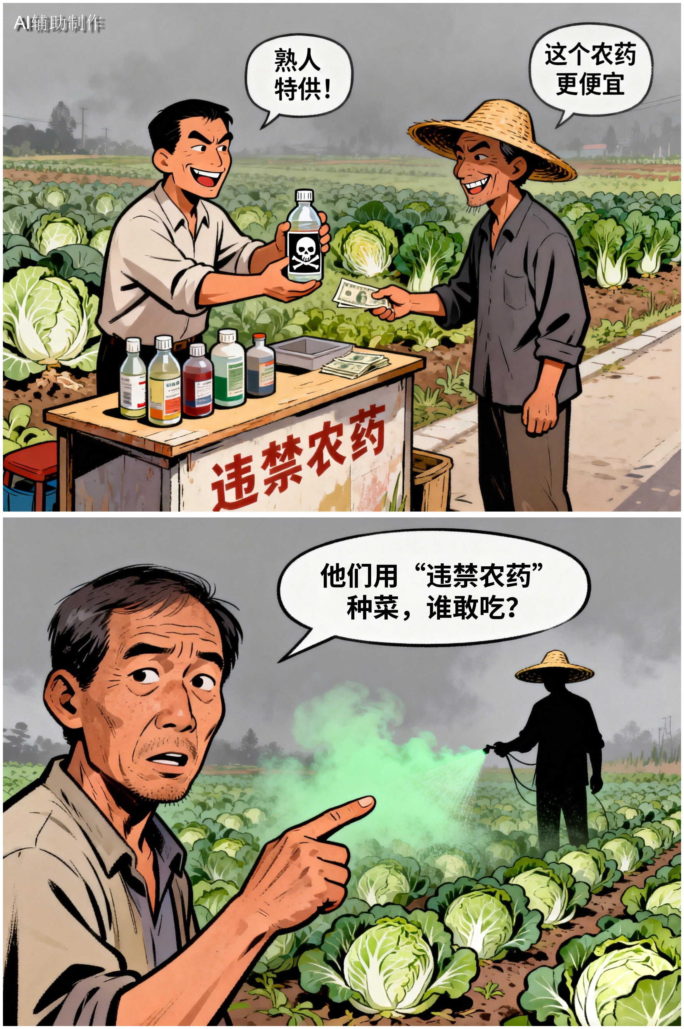 近日,有媒体曝光的农药乱象令人触目惊心。个别商户和企业违规销售国家明令禁止及限制使用的含毒农药,通过伪造生产日期、变换包装、“熟人特供”等方式暗中销售,隐蔽地流入农田,甚至直接用于蔬菜种植。当地村民表示“他们根本不会吃这里的蔬菜”,折射出违禁农药喷洒蔬菜带来的食品安全风险。不法分子为了减少成本或赚取丰厚利润,公然挑战法律底线,更将消费者健康置于巨大风险之中。监管部门须强化管控与稽查,严惩黑色产业链,守住“舌尖上的安全”。(图文:李冬阳)