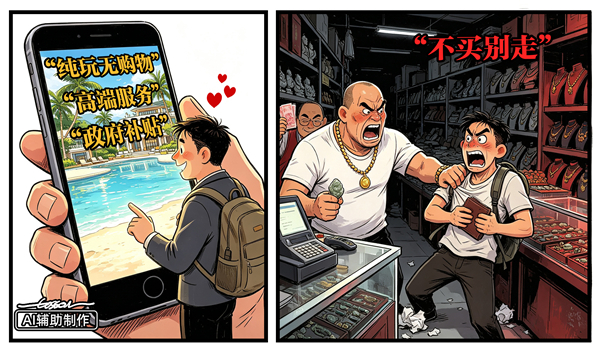 线上谎称“高端服务”“纯玩无购物”“政府补贴”,线下实际体验却“货不对板”,仿佛打开了“卖家秀”与“买家秀”的残酷对比。这种名不副实的旅游套路,不仅侵害消费者合法权益,更严重扰乱旅游市场秩序。必须重拳出击,斩断灰色利益链,以刚性监管净化市场环境,守护舒心旅途。(图文/张博森)